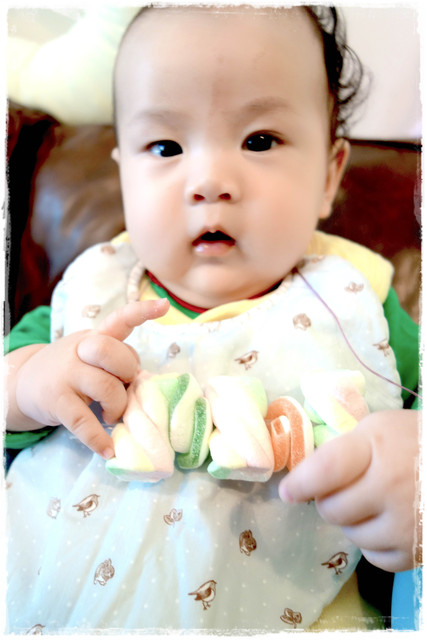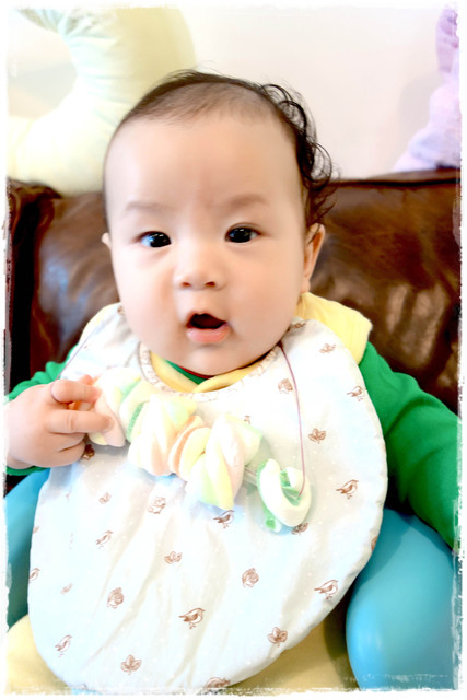 大概滿4個月時,艾寶對於雙手感到津津有味,狂吃個不停... 接著就開始口水牽絲,像是螃蟹一樣「咕嚕咕嚕」地噴泡泡; 老實說,貝姬和艾爺不是個依照傳統習俗的爹娘,但貝姬奶奶一直念說:「老一輩不是都說4個月要收涎?」(啊奶奶自己不就是老一輩??還說別人叫老一輩?!?是都忘了自己已經是老人的身分了...)好吧,貝姬也來幫艾寶弄個收口水儀式好了,但用自己的方式來舉行這個儀式。