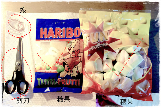 接著就可以隨意拿小熊糖和棉花糖交錯捆在吸管上
