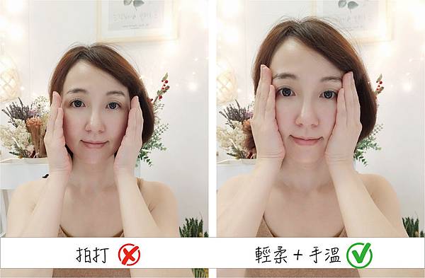 用輕壓(不要拍打)利用手的溫度順勢讓肌膚吸收保養品的精華,從臉頰的兩側開始,再到鼻翼左右兩頰,最後額頭與下巴的部位,讓全臉的每個角落徹底地吸收與呵護。